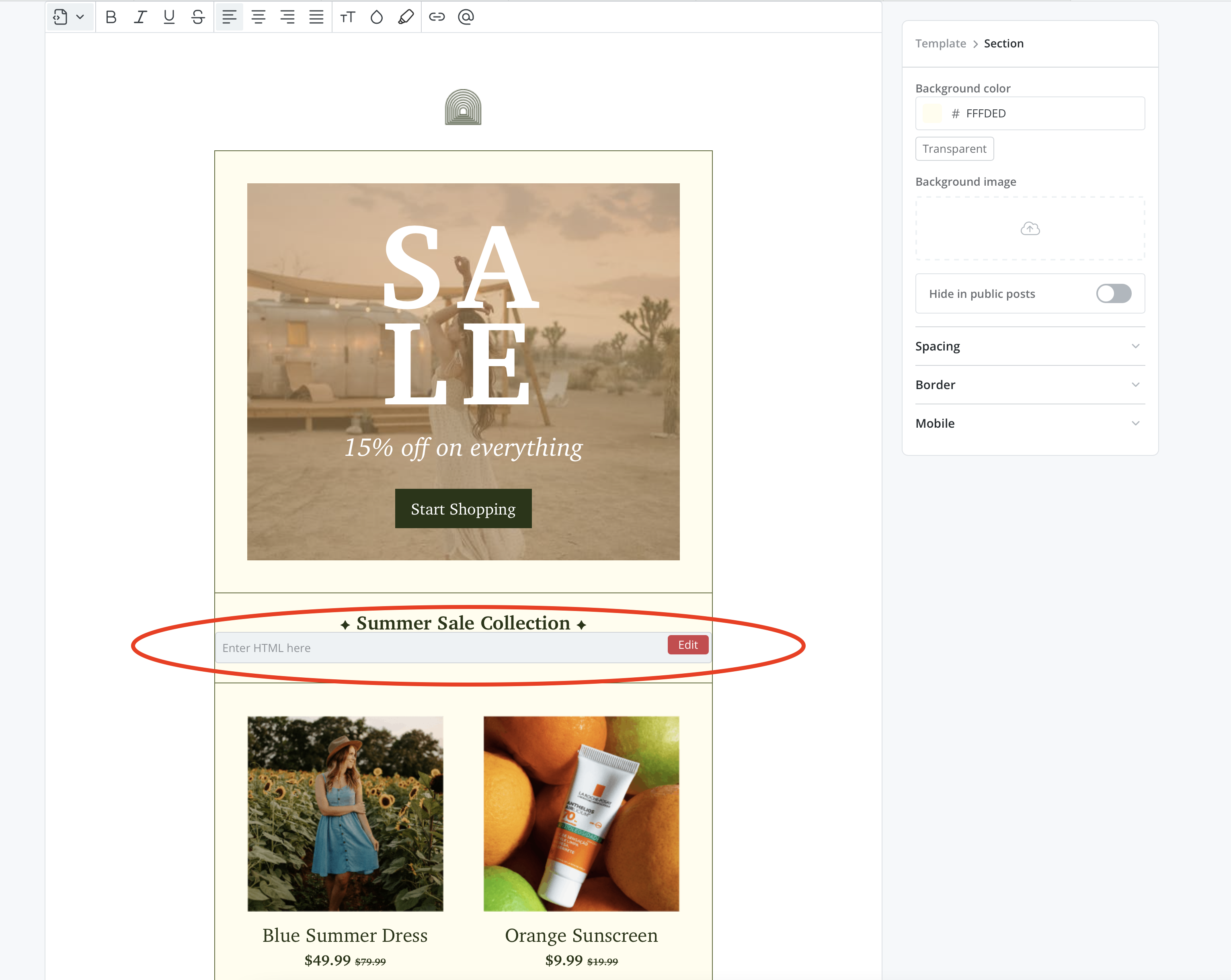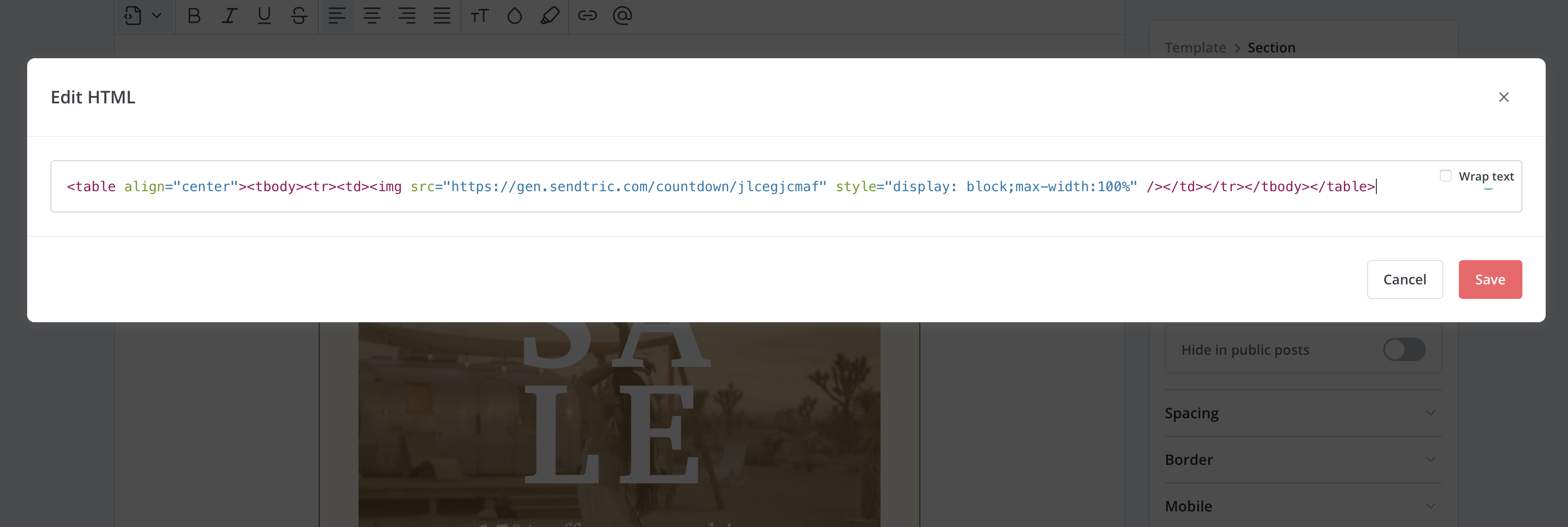 Go back to the ConvertKit email builder and paste your Sendtric countdown timer HTML into to box “Edit HTML” box that has opened. Press the red “Save” button.