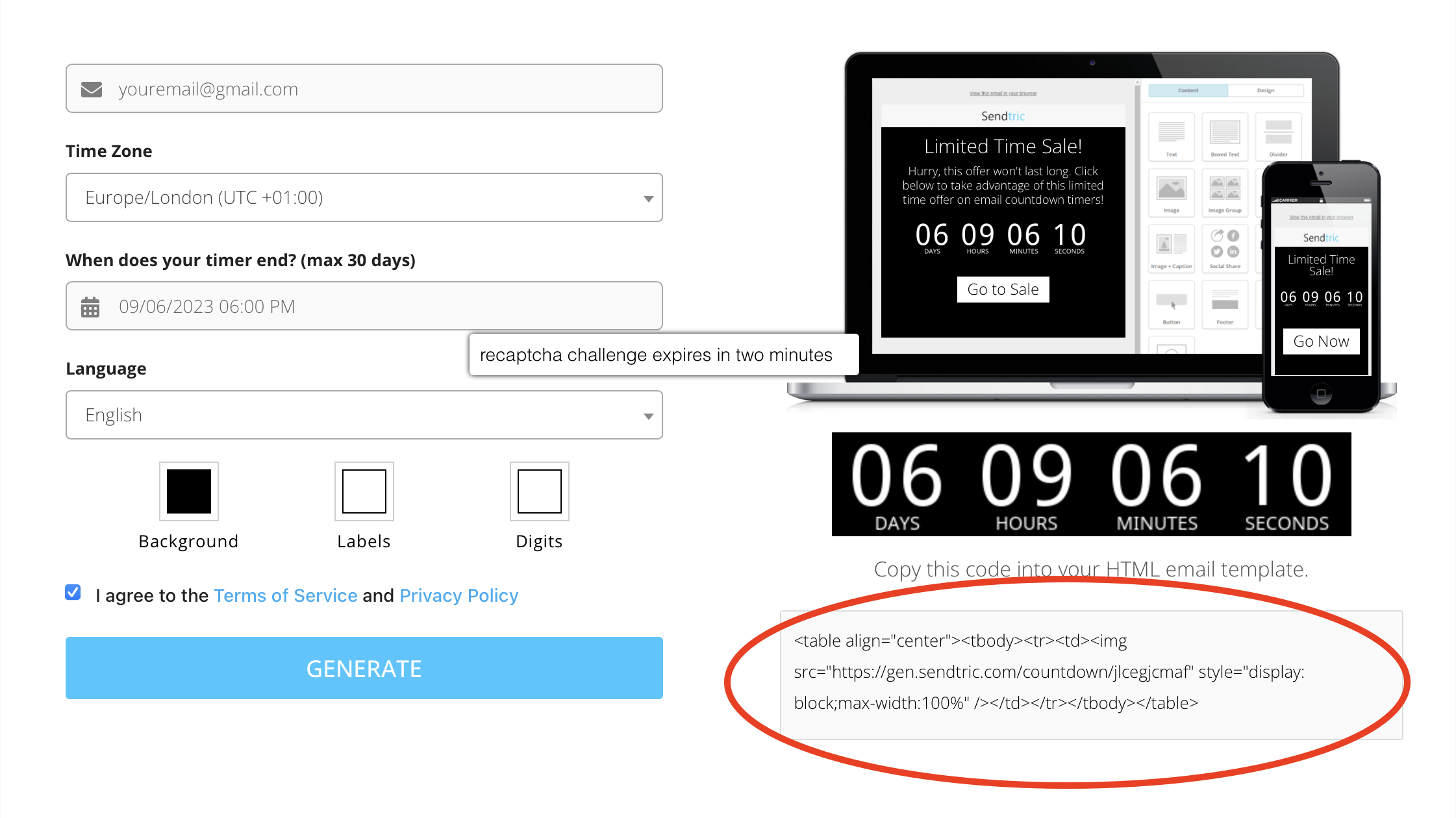 Simply add your email address, set the timer end date and time, and choose your customization options. When you’re ready, hit the “Generate” button and copy the unique HTML code that is generated and displayed on the right.