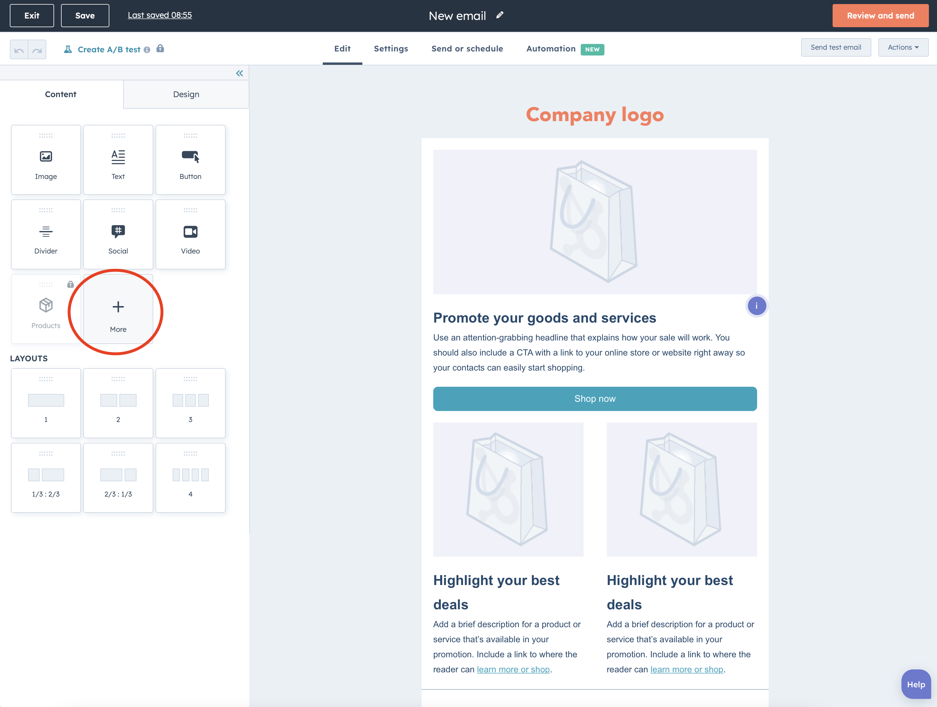 Open the email builder in HubSpot and create a new email (or use an existing template or campaign).