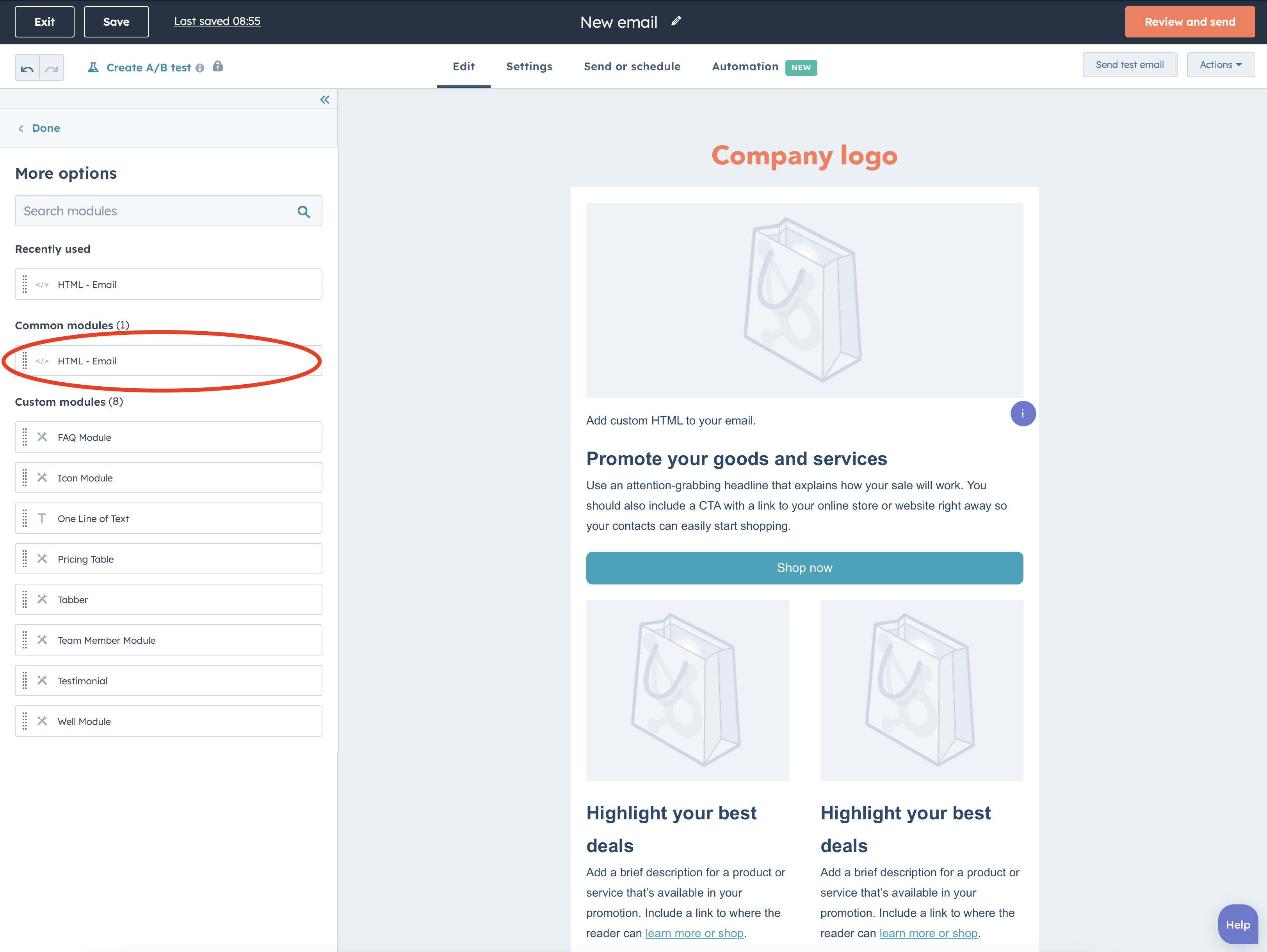 Choose “HTML – Email” from the options on the left in the email builder. Drag the new HTML block and drop this wherever you would like your Sendtric timer to appear in your HubSpot email.