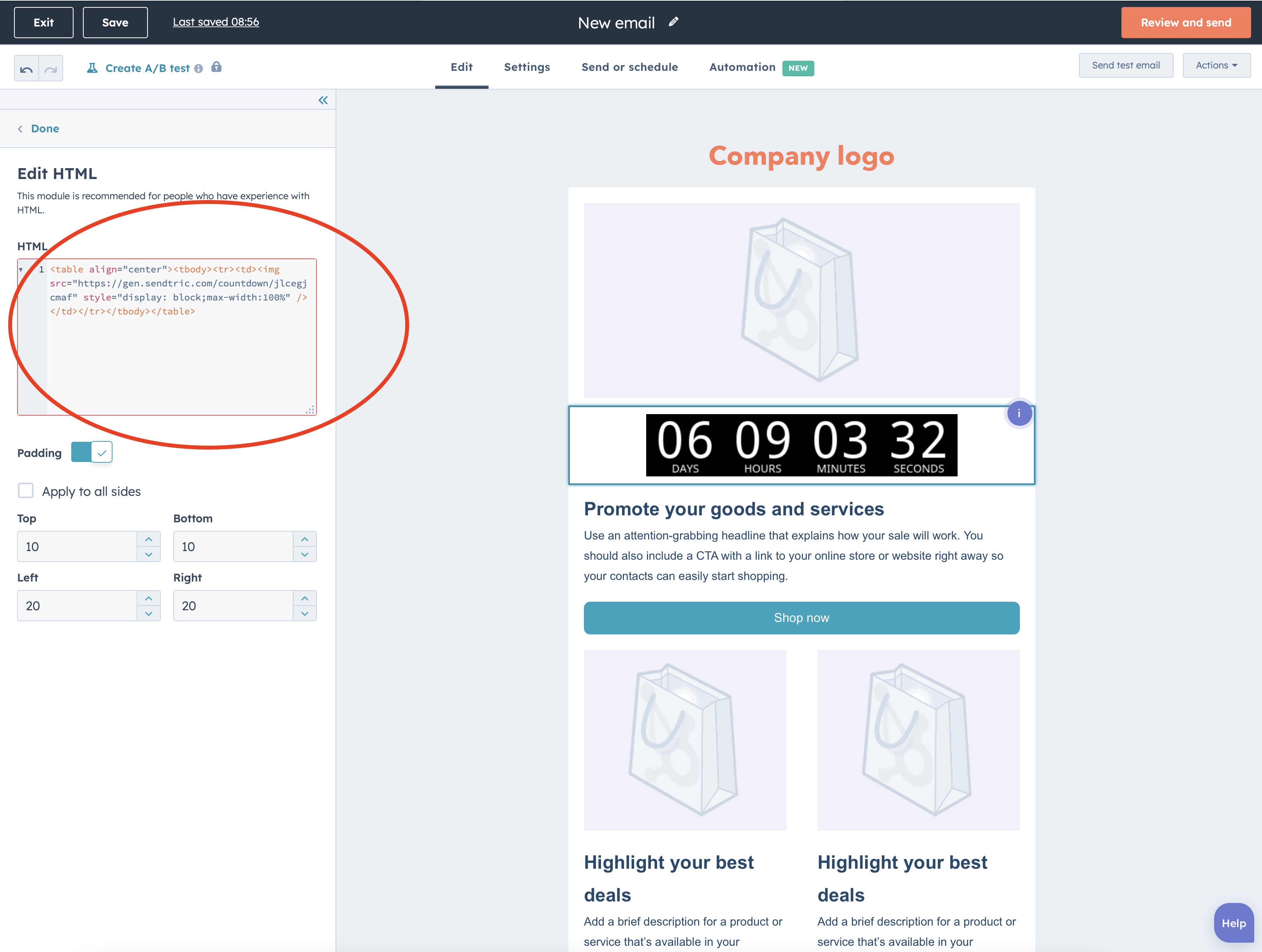 Paste your Sendtric countdown timer code into the “HTML” box on the left of the HubSpot email builder.