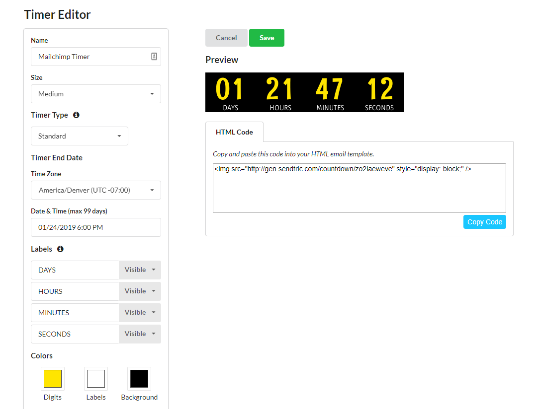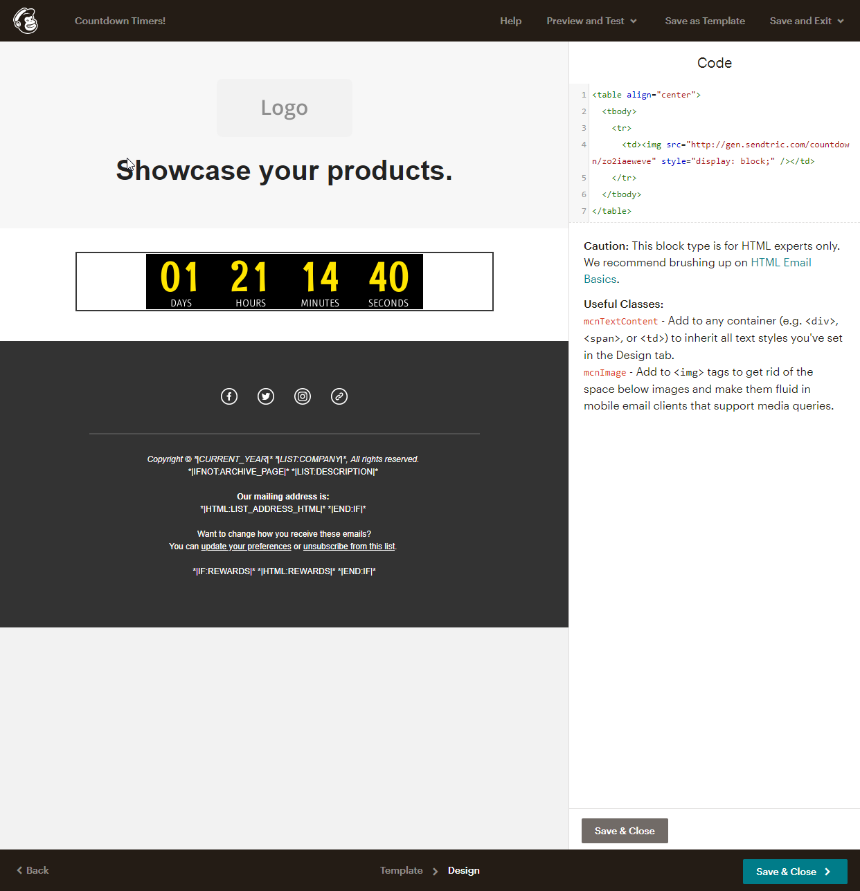 3. Copy the timer code from Sendtric and paste it in the “Code” section for the Code block you just added to your template (or add to the appropriate location in your “Code Your Own” HTML template). If you would like your timer to be centered, here is some additional code to help center the timer for all email clients: