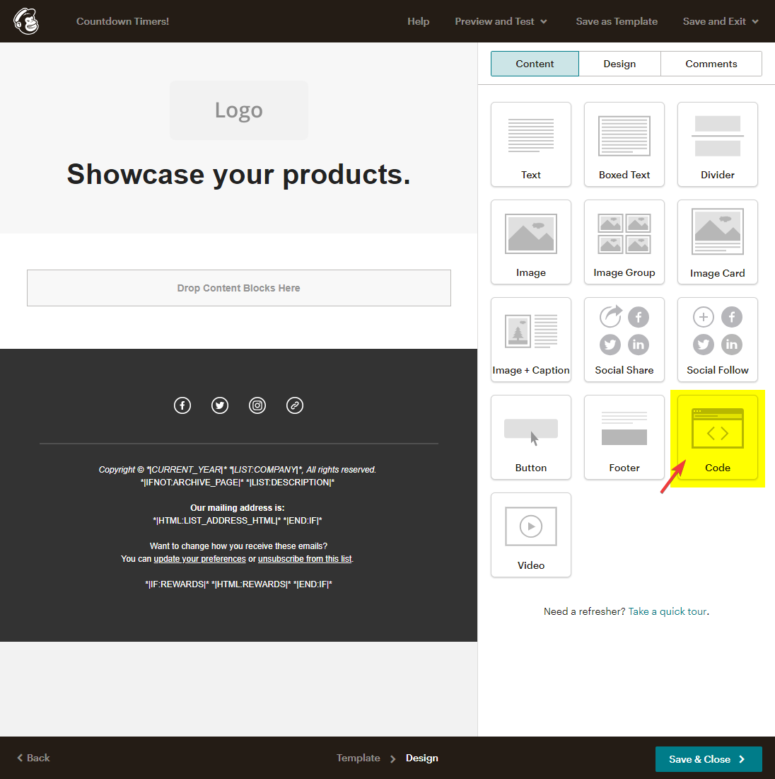 2. Open your Mailchimp campaign in the template editor and select the “Code” option in the “Content” tab. Drag the box into your template where you would like the countdown timer to appear. If you are using a “Code Your Own” template, navigate to the location in the HTML code where you would like the timer to appear.