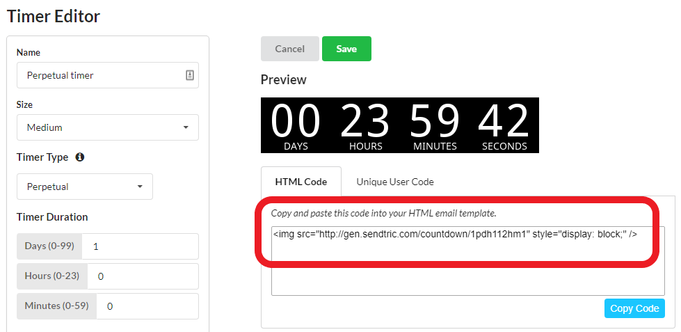 4. Customize your timer in the editor, and when finished, copy the embed code to include in your HTML email template: