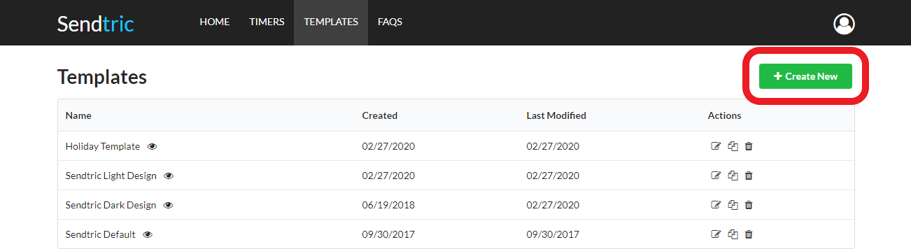 1. Click on the “Templates” tab and click the “Create New” at the top of the page: