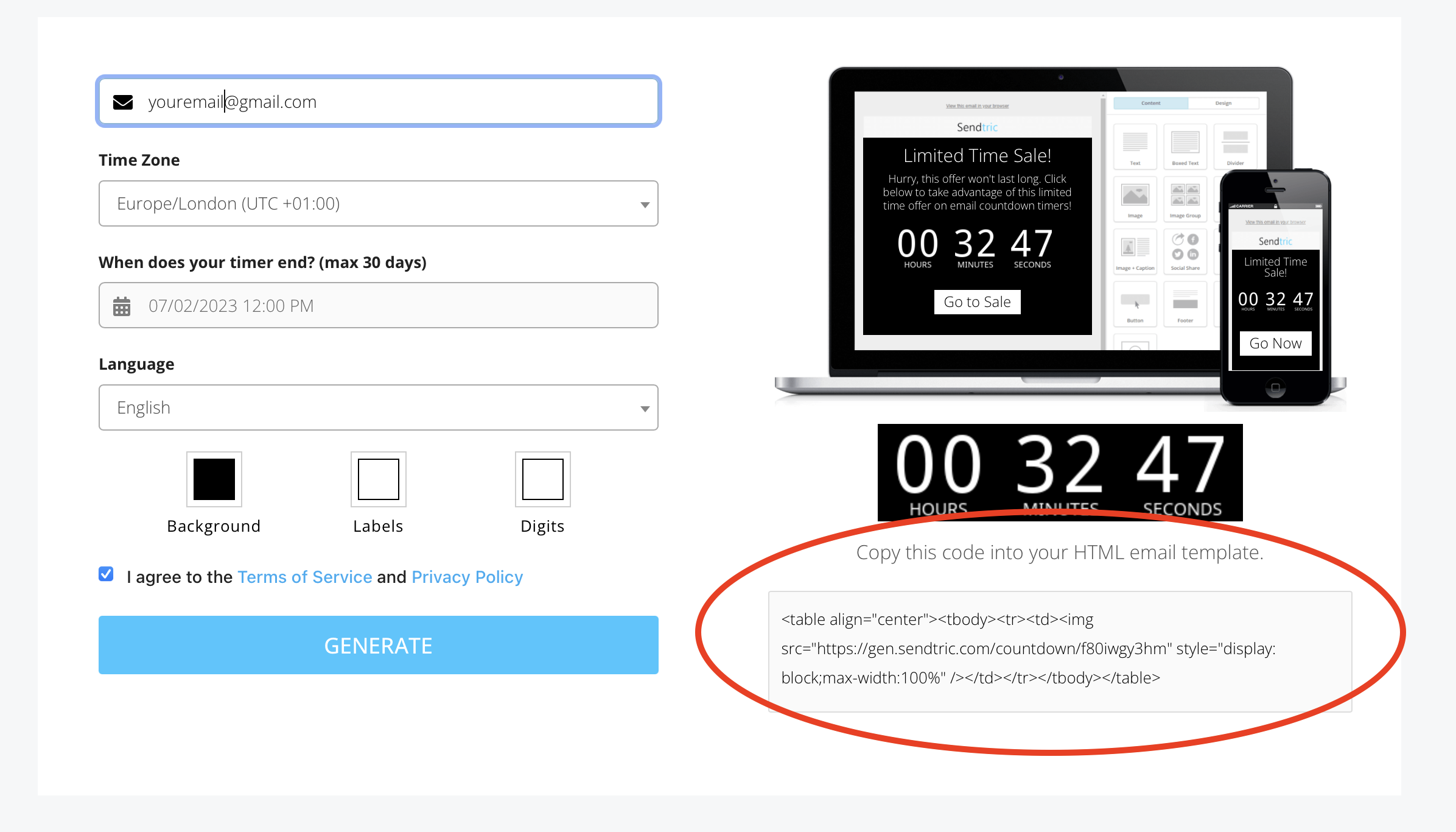 Simply add your email address, set the timer end date and time, and choose your customisation options. When you’re ready, hit the “Generate” button and copy the unique HTML code that is generated and displayed on the right.