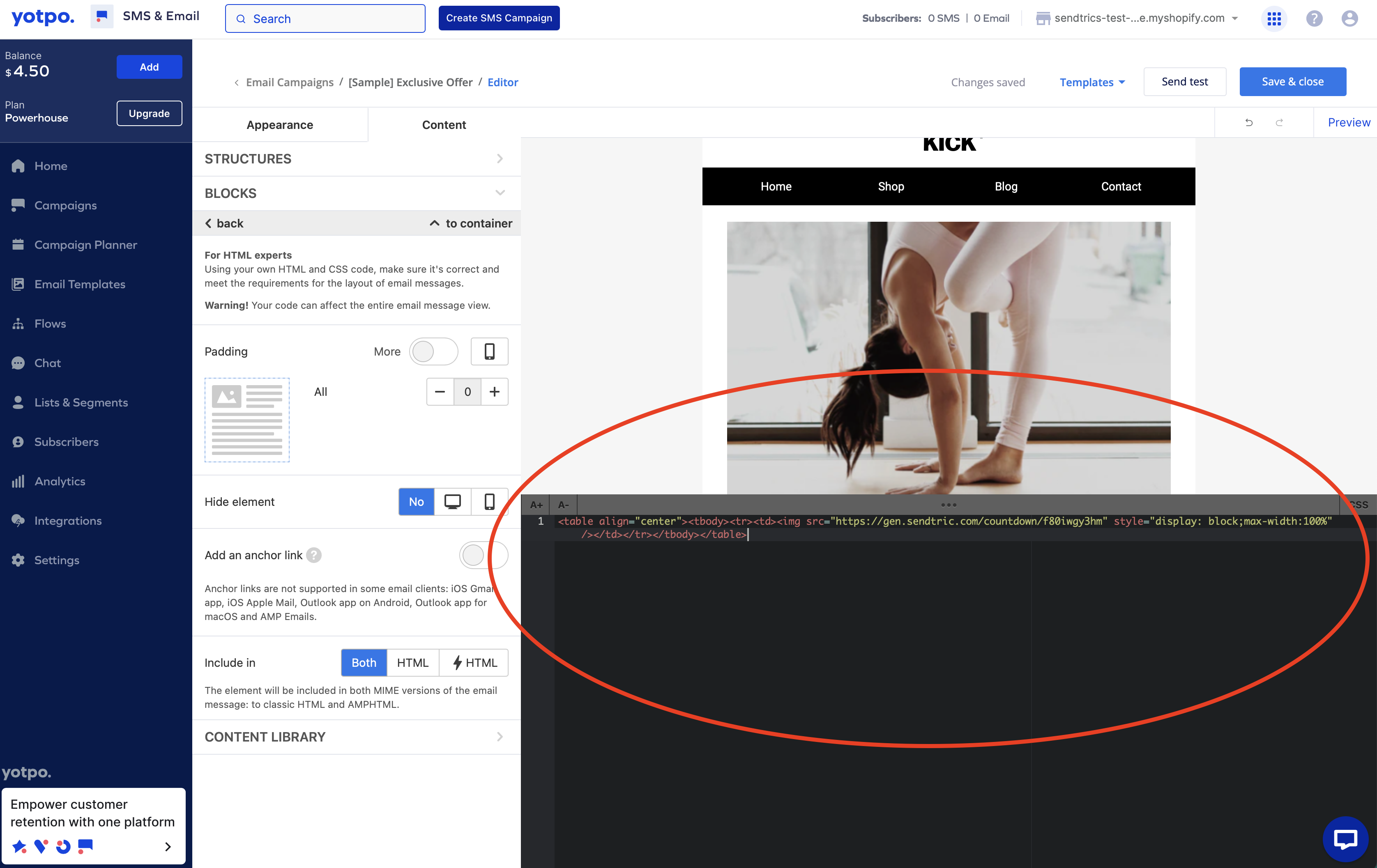 Back in your Yotpo email builder, paste your Sendtric HTML code directly into the black container of your content block, then click the blue “Save & close” button on the top right of the screen.
