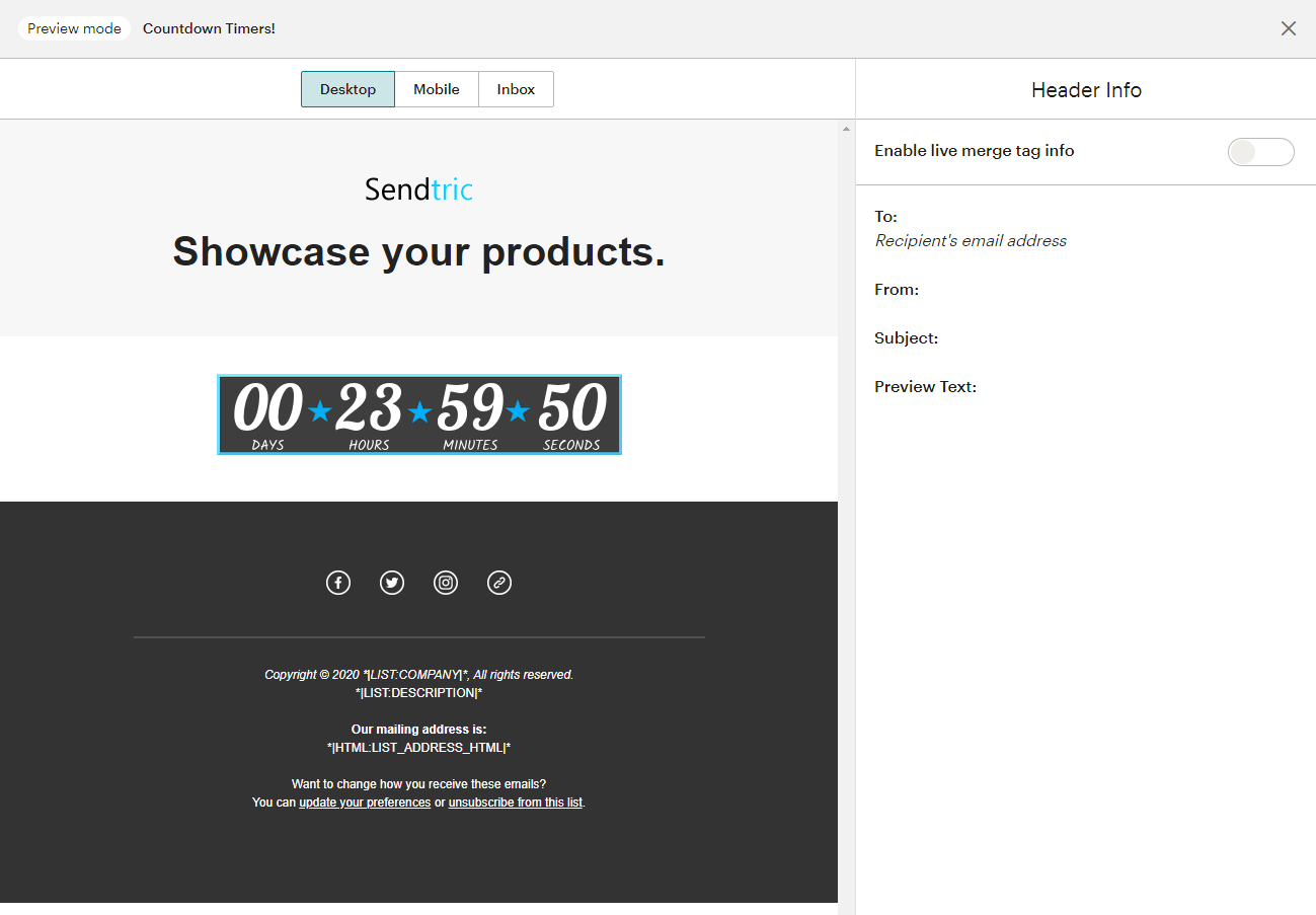 This guide will cover integrating Sendtric Dynamic Timers in the Mailchimp platform. To see our full list of setup guides, click here.
