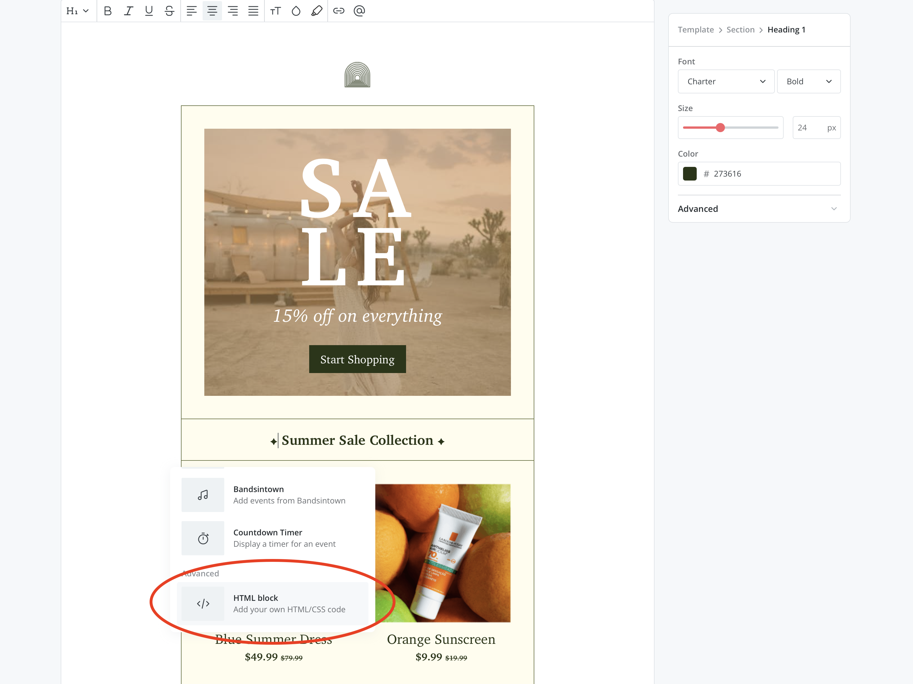 Go back to the ConvertKit email builder and paste your Sendtric countdown timer HTML into to box “Edit HTML” box that has opened. Press the red “Save” button.