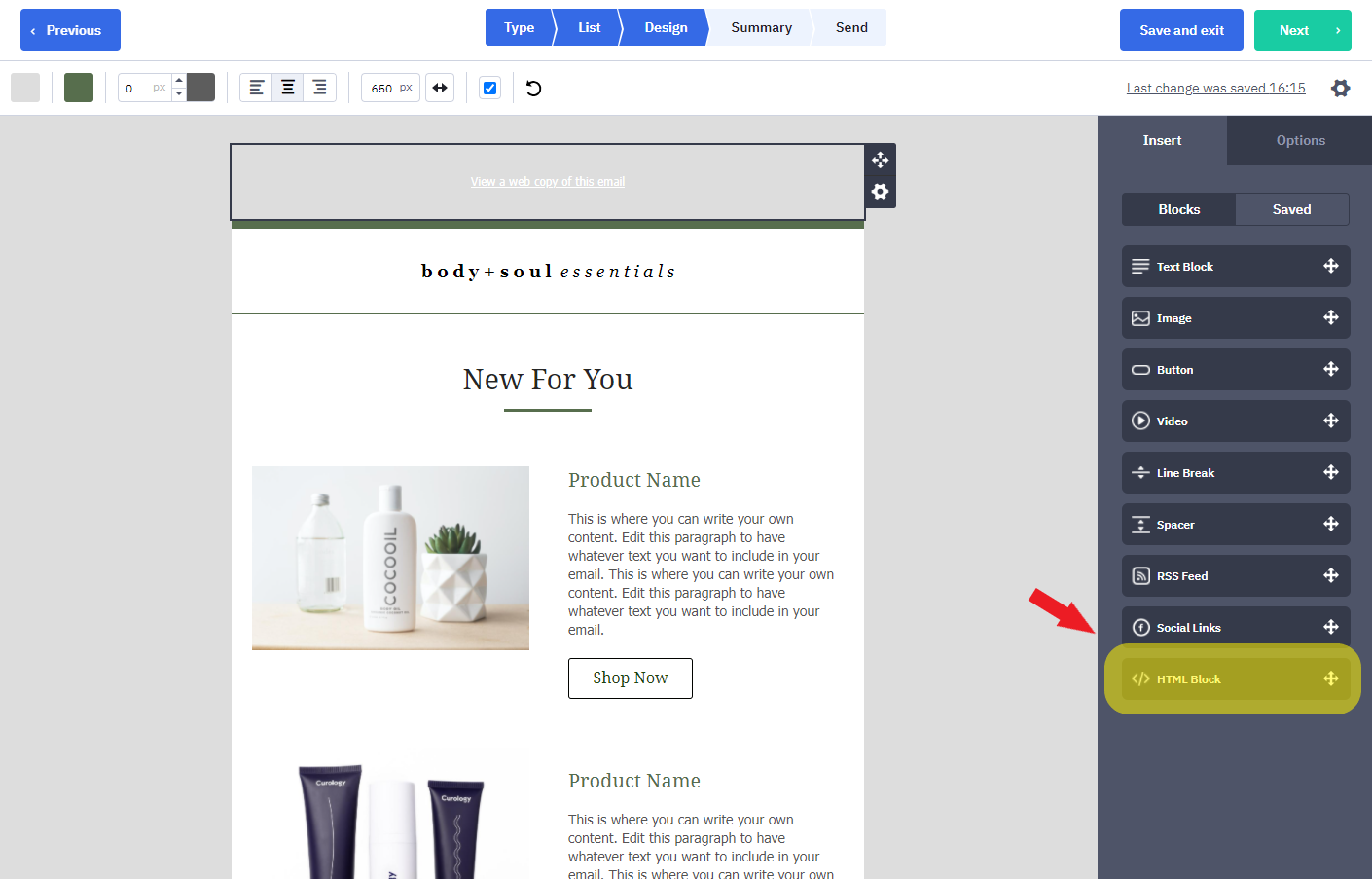 2. Open your ActiveCampaign campaign in the template editor and select the “HTML Block” option in the “Insert” tab. Drag the box into your template where you would like the countdown timer to appear.
